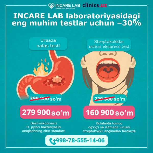 SKIDKA 30% — INCARE LAB laboratoriyasidagi eng muhim testlar uchun!